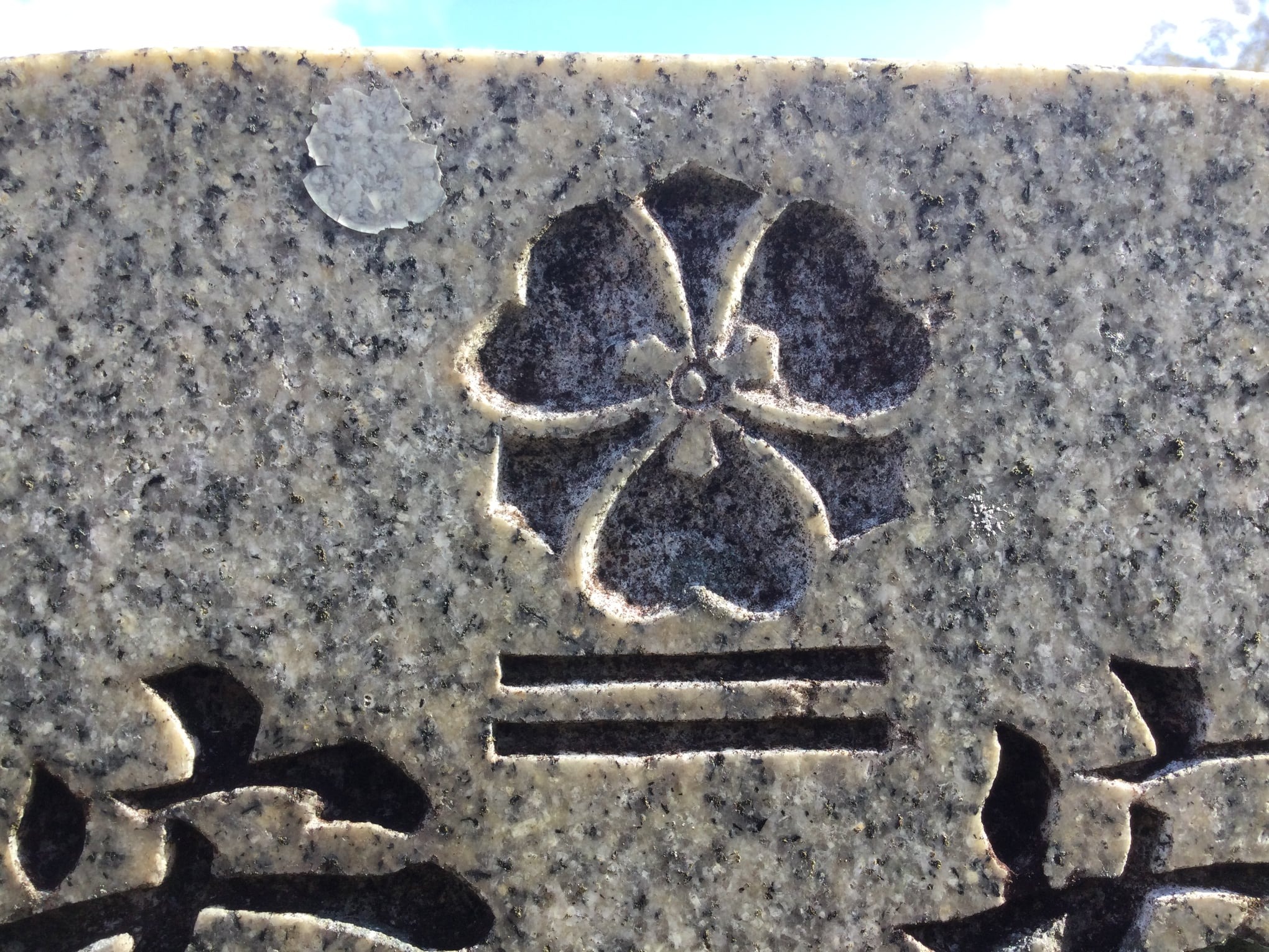 今回採取した植村さんも、名字が同じだから、大名植村氏に合わせたということではないでしょうか?とは言うものの、墓地の株を示す石標には「違い鷹羽」、先祖を祀った墓石(明治以降に建立)には「一文字下に三つ剣形」が彫られていました。三つ巴の他には「抱き茗荷」もあり、いずれが本来の家紋なのか?悩むところでした。