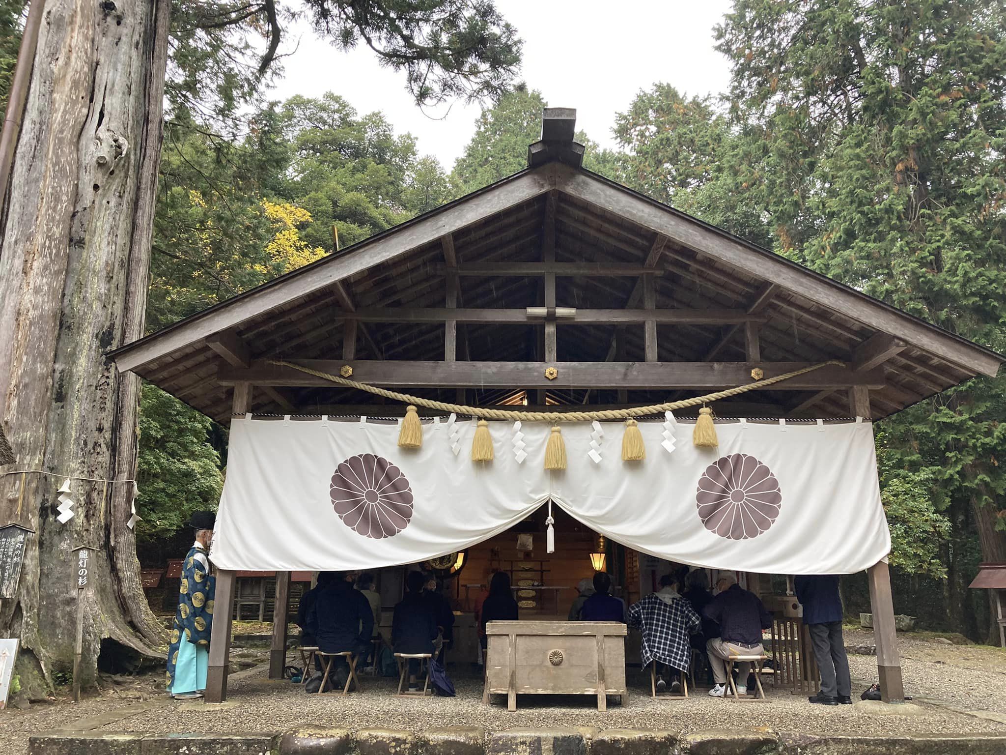 拝殿から鼓の音と好く通る謡の声が聞こえてきて、つい誘われて覗いてみると、神様への奉納の儀が行われているようだった。その音、声は雨にそぼ濡れた内宮によく似合っていた。また、神社に参拝するとき雨や風があると神様に歓迎されているという話もあり、今日の元伊勢参拝は宜しきを得たようだ。