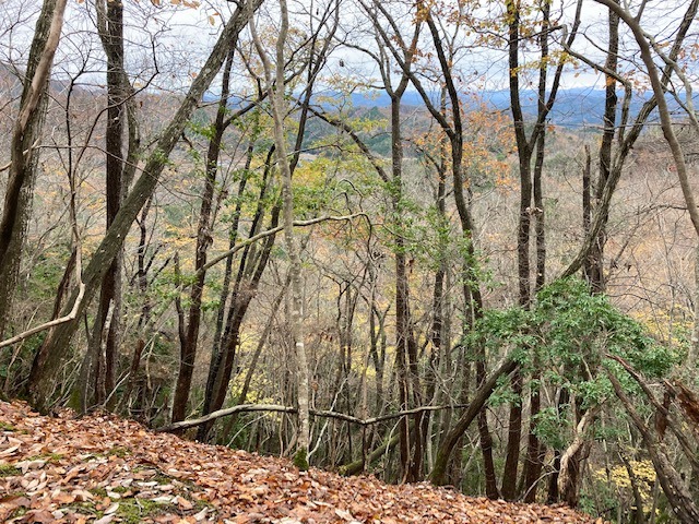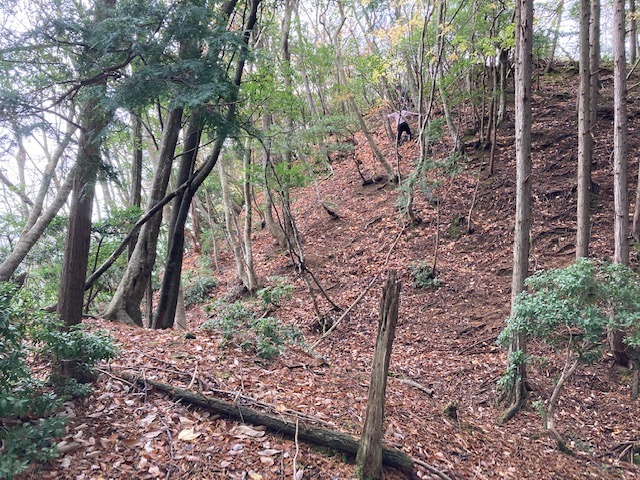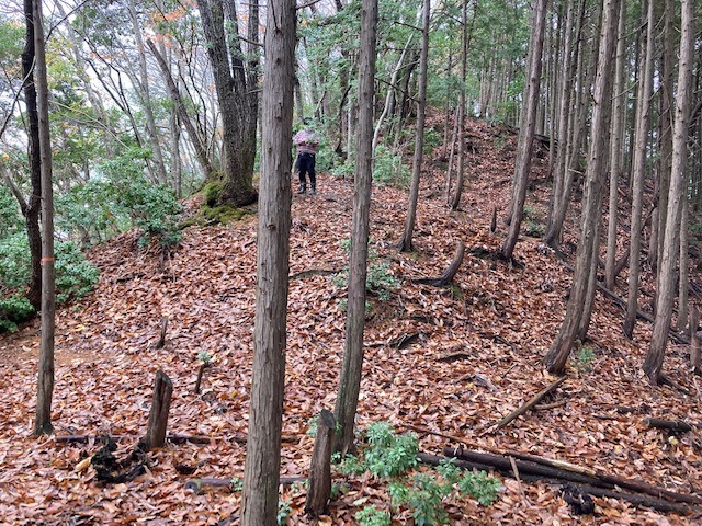 出会った地元の老人のアドバイスを受けて、鹿島神社より城址に至る急尾根を登った。こちらは金山城よりも急斜面でぬかるみ、落葉が散り敷いている。時々滑り落ちそうになりながら、城址まで登った時には汗だくであった。