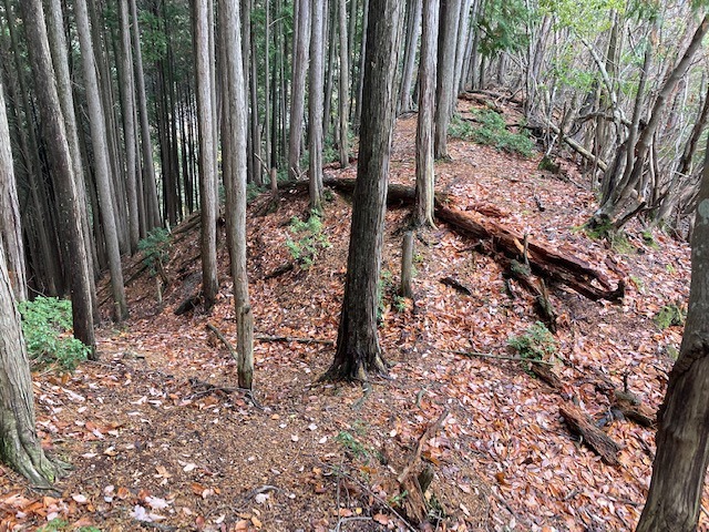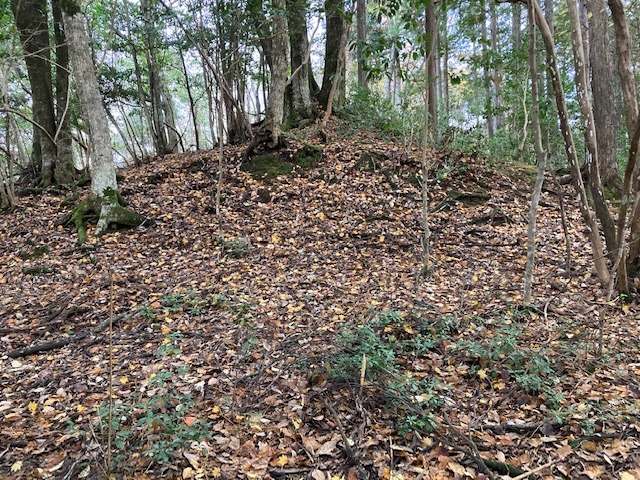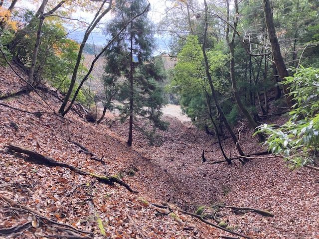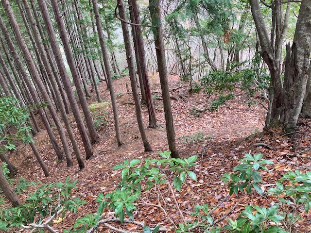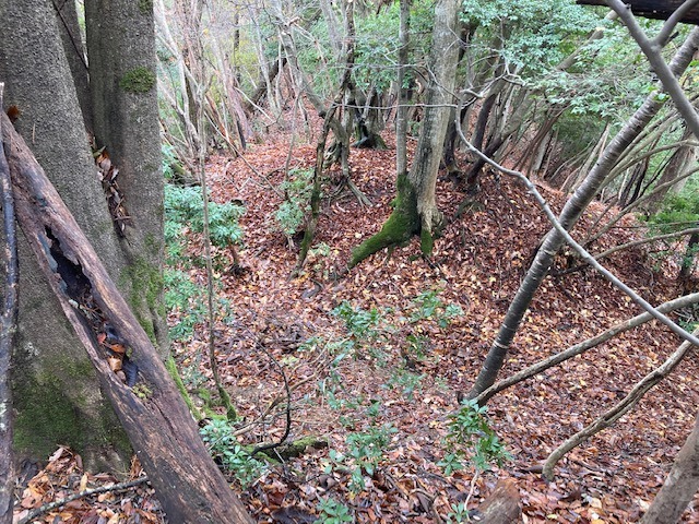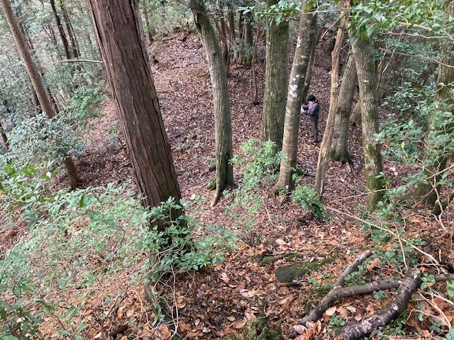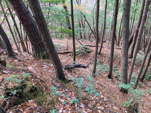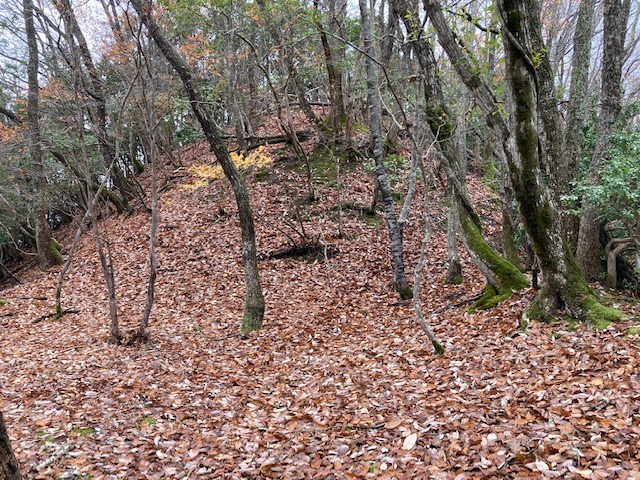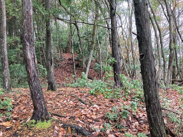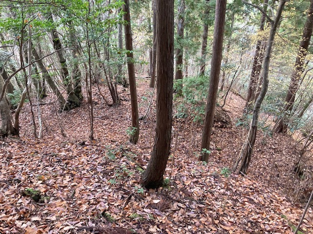 先に登った二つの山城に比べると、小ぶりながら尾根筋を堀切で遮断し切岸で防御している。総じて自然地形に近い状態。おそらく、桐村城・大呂金山城の前衛であり、見張り所的な役割を担ったものであろう。