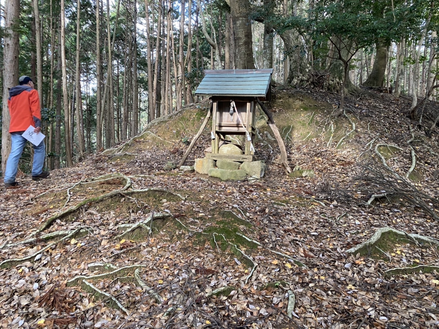 天寧寺脇から山に分け入り、中腹まで登ったところに祀られている祠が最初の曲輪。そこから、さらに尾根筋を登ったピークに主郭を置き、三方に伸びる尾根に曲輪を構えている。