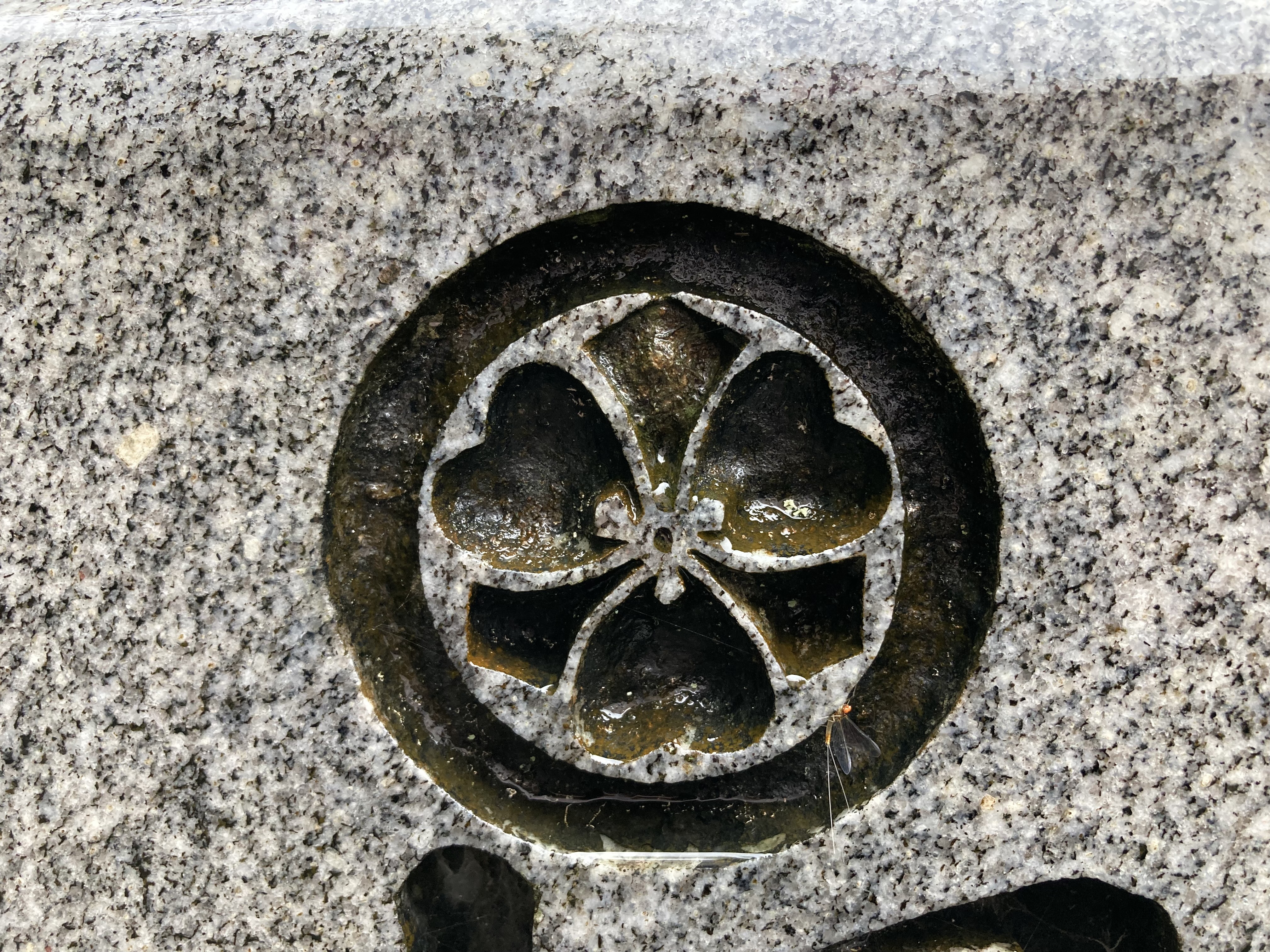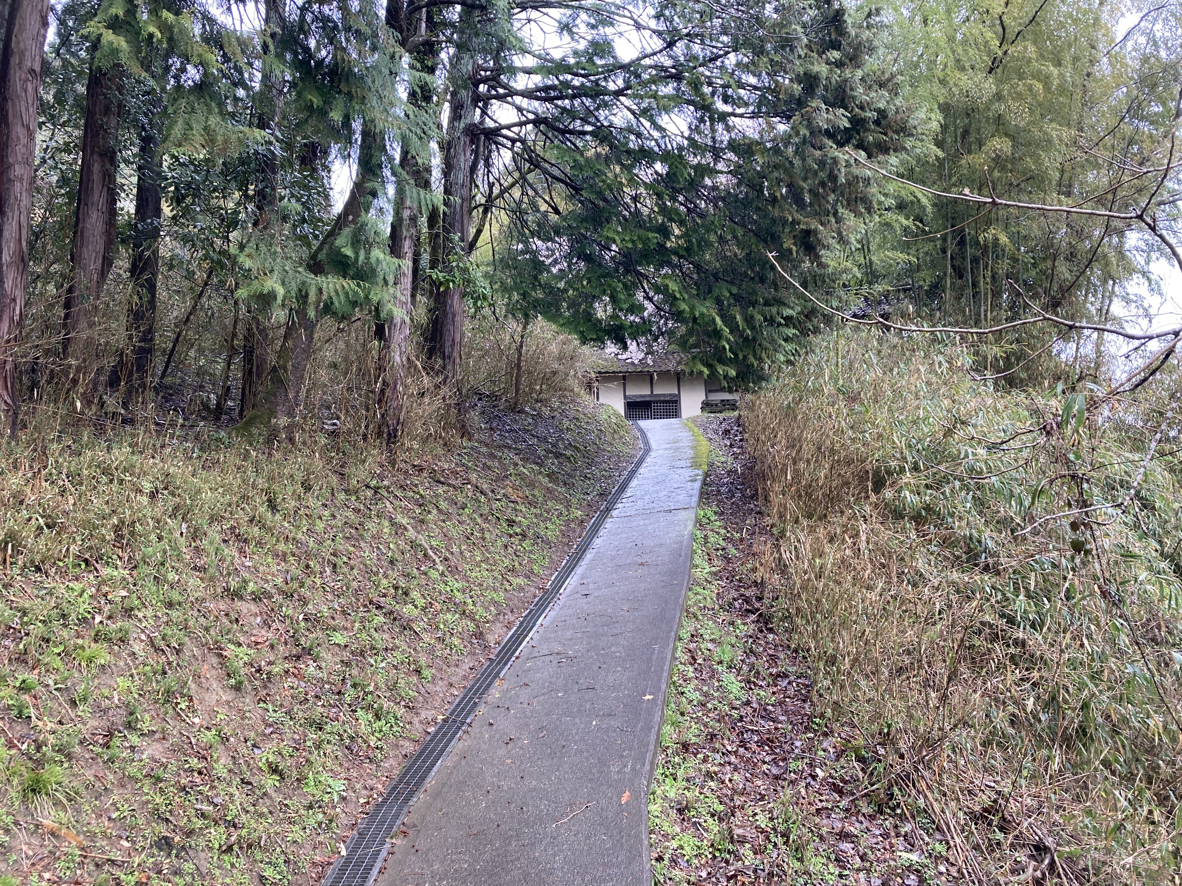 傘をさして滑りそうな参道登ると「三つ巴」の大槻さん、「剣酢漿草」の桐村さんらの墓石が並んでいた。福知山市東部における大槻さんは「雁」紋を用いる家が多いが、西や北に行くと家紋が異なるのは由緒の濃淡だろうか?また、桐村さんは牧川を挟んで南は「剣酢漿草」、北は「巴」紋に分かれているのも興味深い。