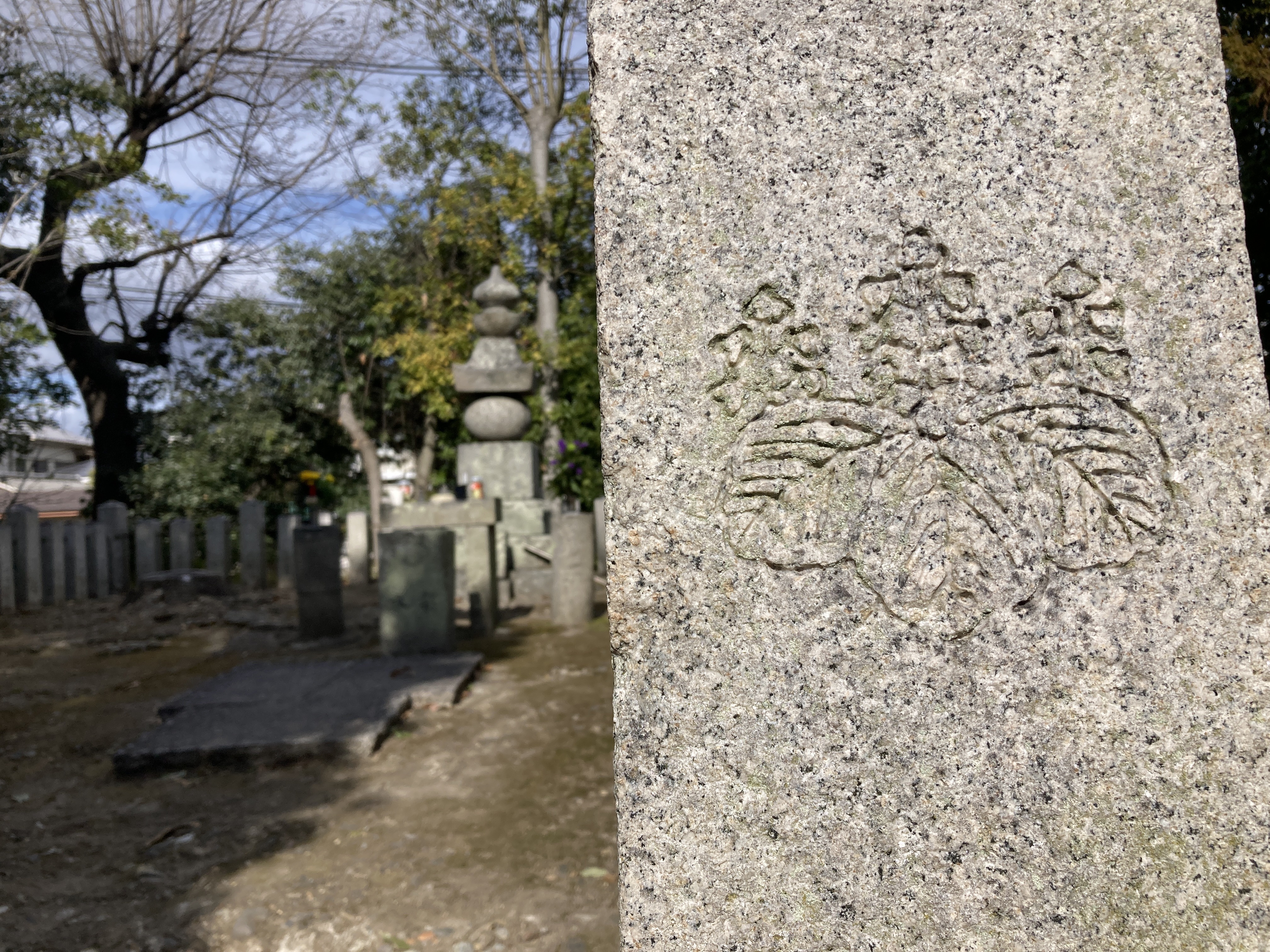 塚の古い香台には「五三桐」、石柱には「五七桐」が彫られ